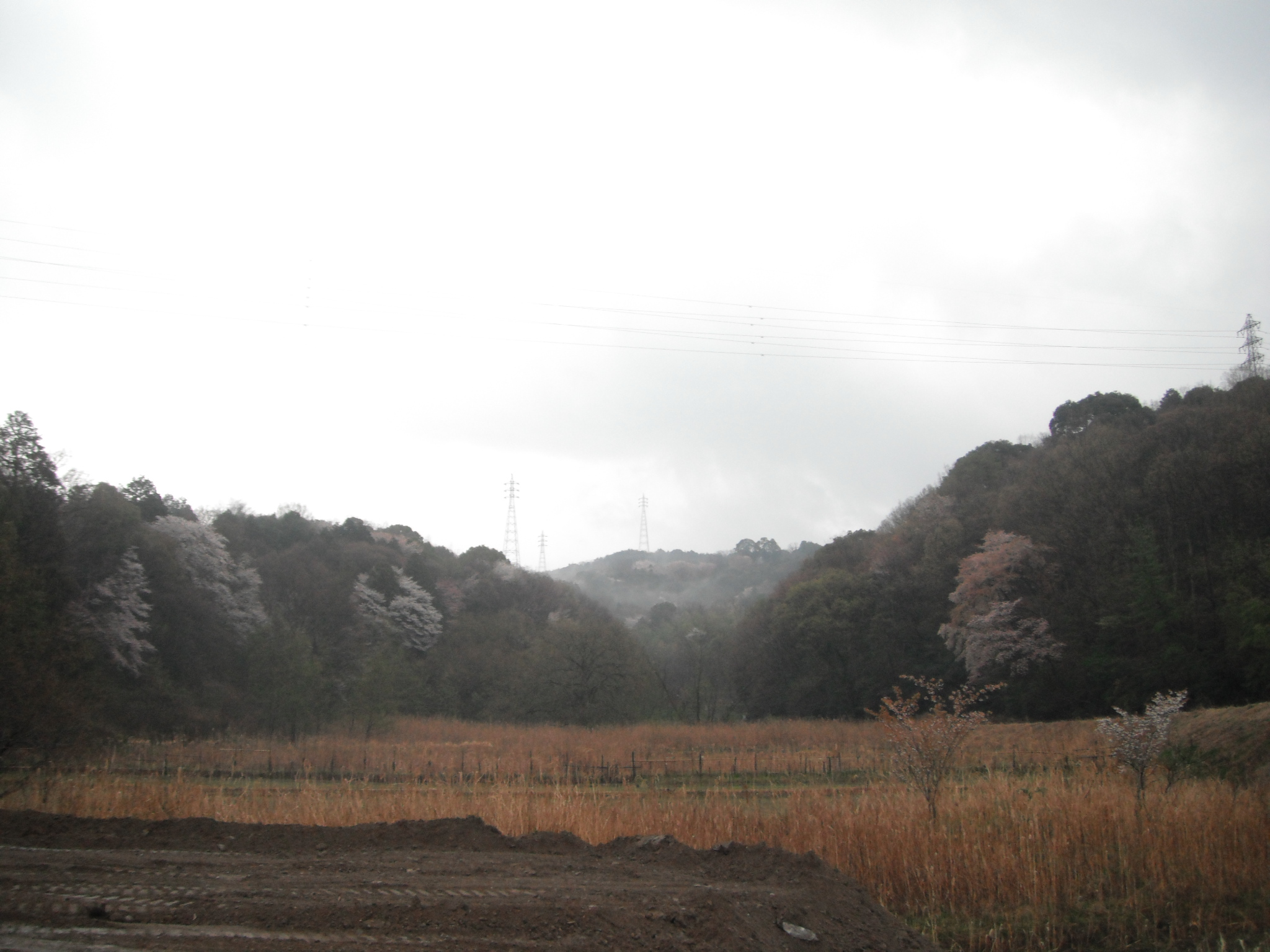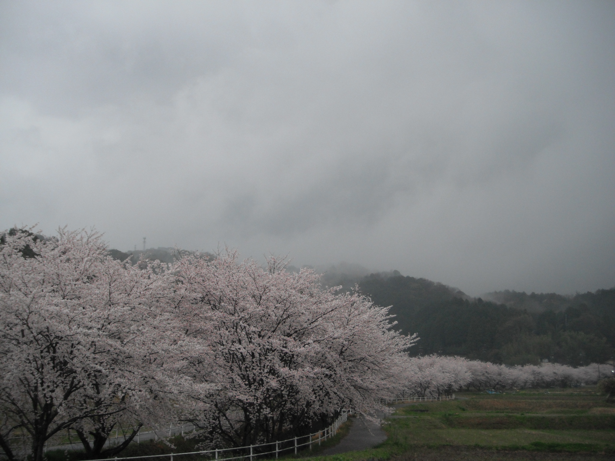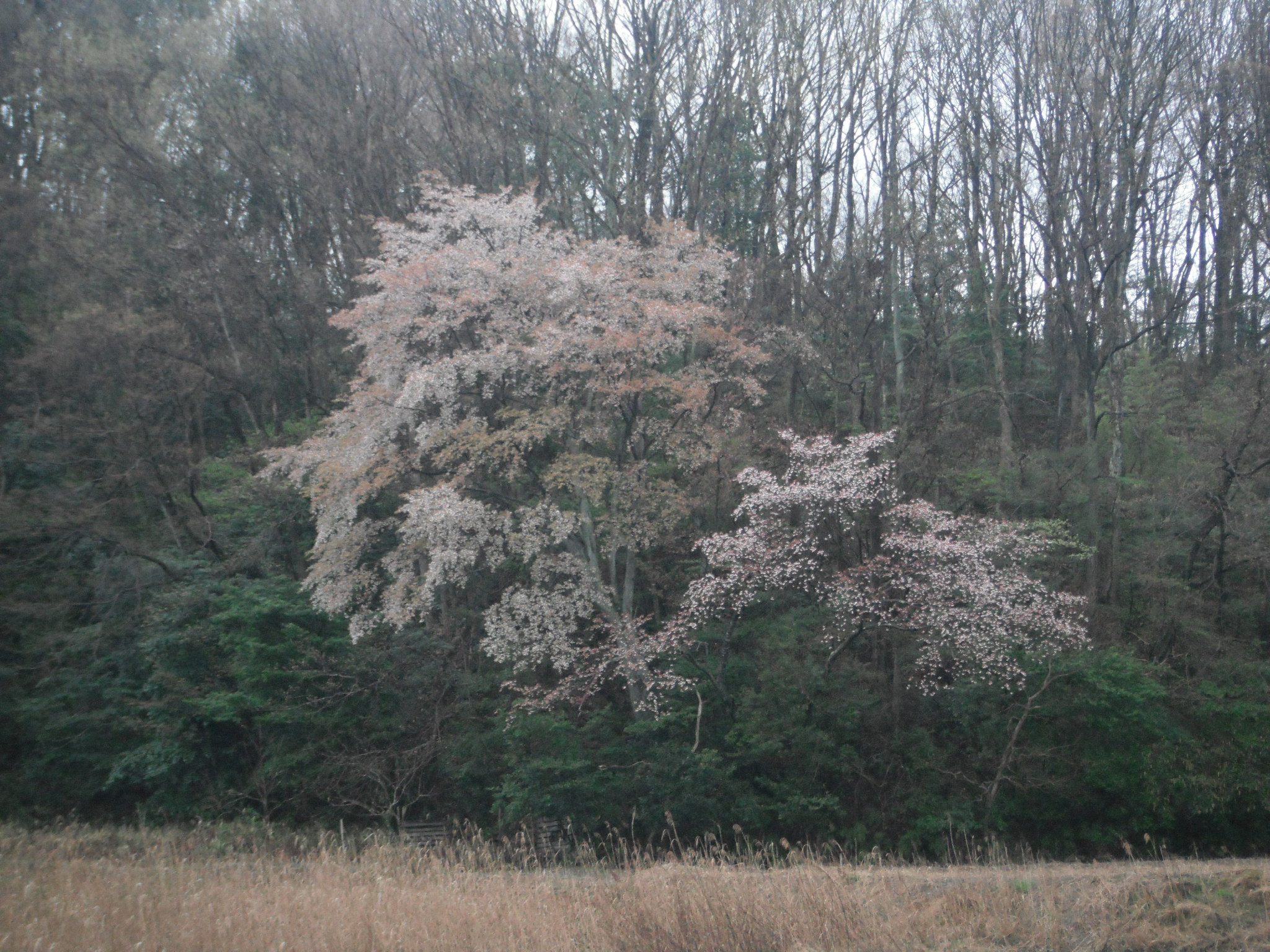 買い物途中で、バ-ッと急に雨が降り、その後冷たい風が強く吹き出し寒くなった。 帰ってきて、しばらくしてから、またかめと散歩。 里山桜並木コースへ。 雨上がりの春の山の眺めがとてもいい。 山の中に桜があちらこちらでもこもこ。