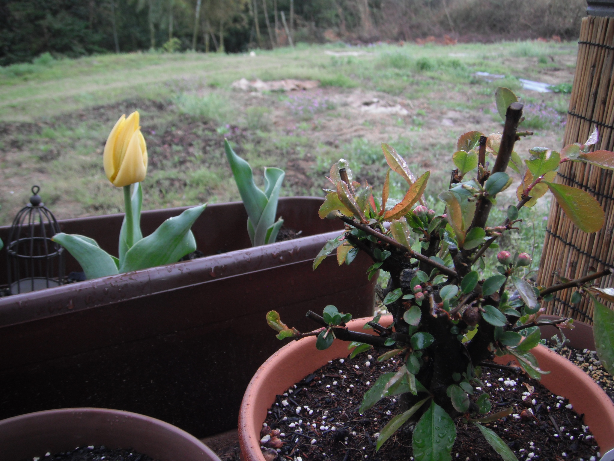 チューリップも第一号開花! トップは黄色だった。 何色がどこに植わっているのかわからないのであった。。。 こちらも、昨日の朝はまだこんなに色づいてなかったのに、夕方帰ってきたら、あれま!!ってほど黄色になってしまってた。 すごいもんだ。
