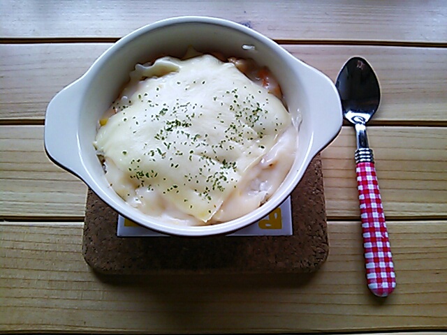 ご飯を炊いて、市販のエビドリアソ-ス、とろけるチーズをのせてオーブンで焼いてお昼ご飯に。おいしかった~。 しばらく前から買ってあって、ようやく食べるに至った。