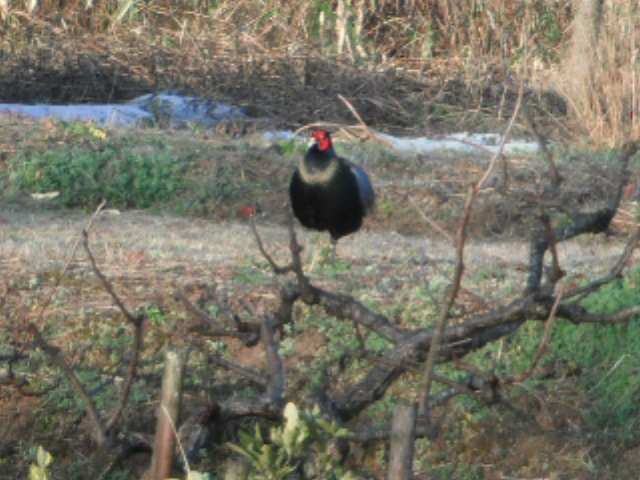 おとついの朝、出勤の少し前に、そはで鳴き声がしたので、窓を開けてみると、前の畑の向こうのほうに、雄キジがてけてけ歩いたり、毛づくろいをしていた。 すかさず撮影。 朝日を浴びて、てかてかと輝くきれいなからだ。