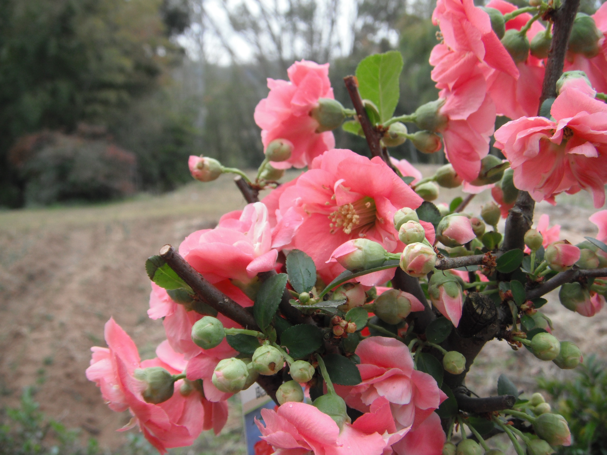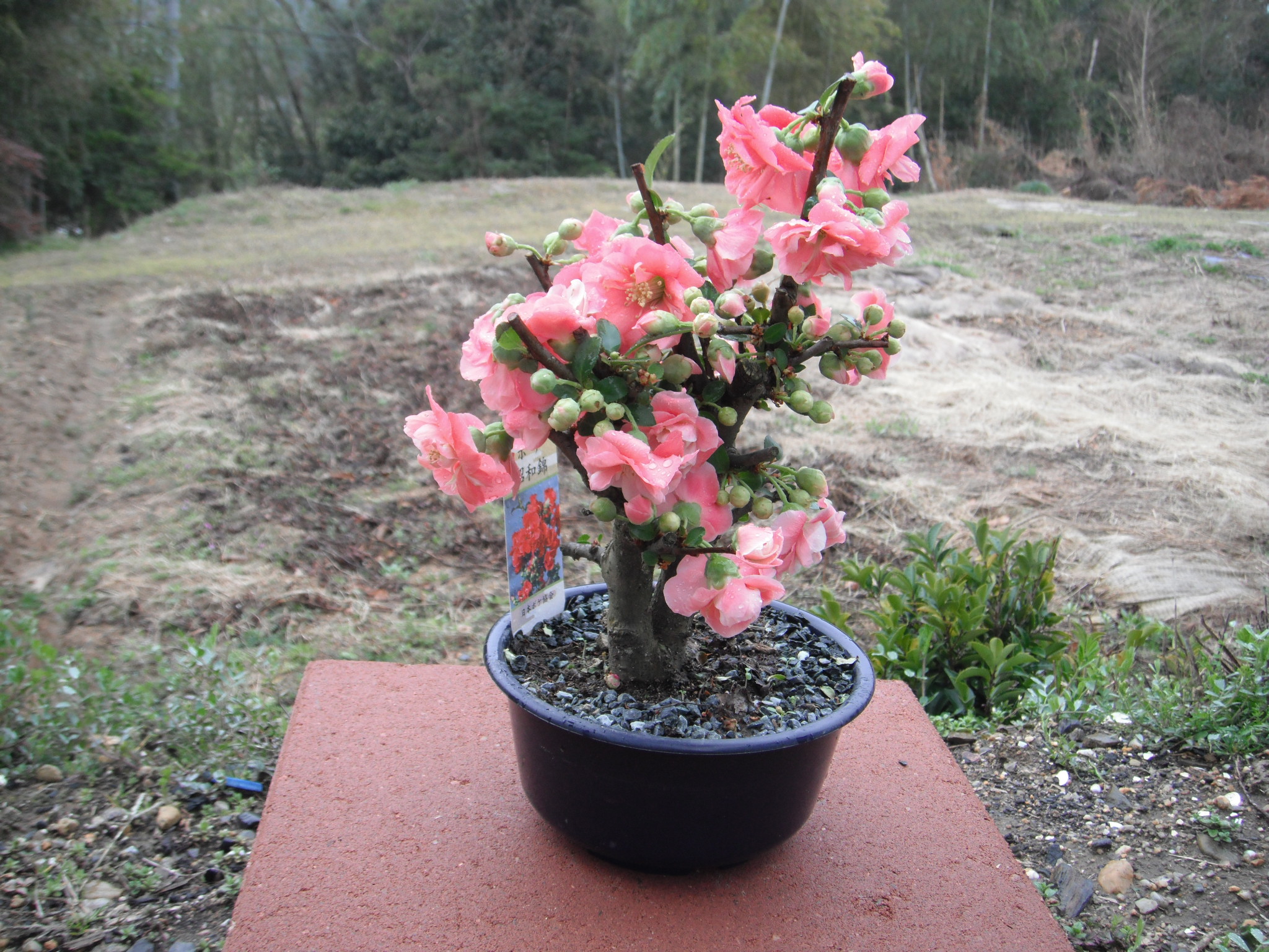 そのあと買い物して、花屋さんをのぞいたら、かわいらしい盆栽があり、900円のが500円に値下げされていて、、ウーン と少し迷ったが、やっぱりとてもかわいくて気に入ったので買った。 花の説明の札に「日本ボケ協会」と書いてあり、それがとてもおかしかった。