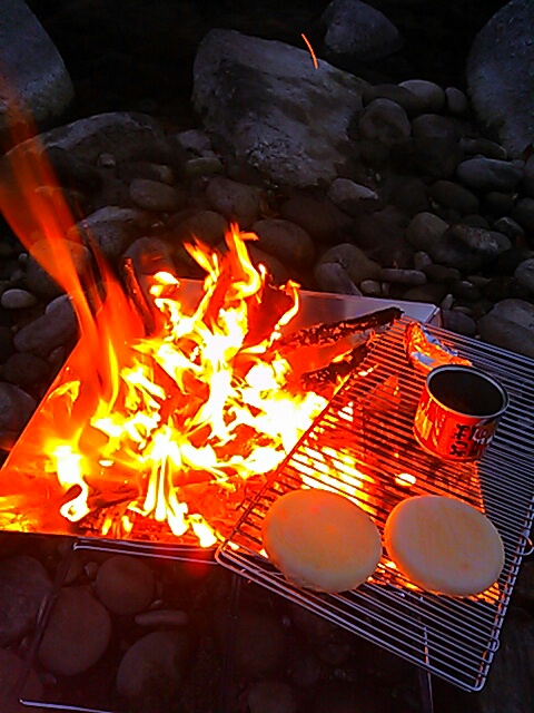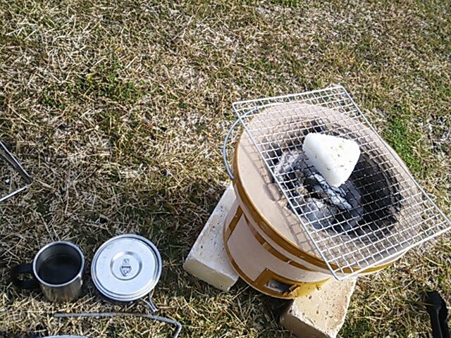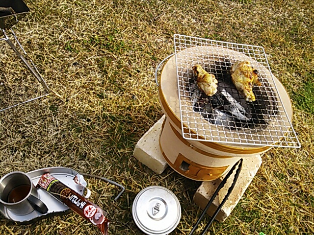 焚き火と七輪炭火焼きを同時にするのは、なかなか忙しかった。 普通の太い薪ならいいのだろうけど、細い枝なのですぐ燃え尽きてしまい、七輪ばかりかまっていると、焚き火がちっさくなってしまい。。