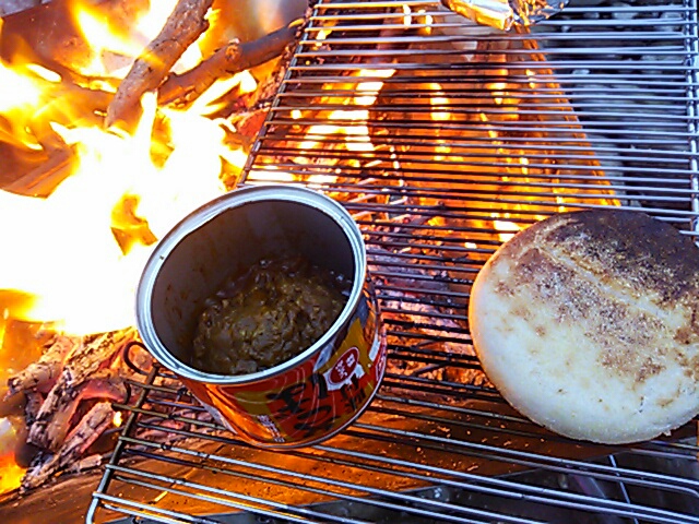 缶づめの空いたものを利用。 少し火にあてたらぐつぐつと煮たってきて、今回はあったかいキーマカレーを、こんがり焼けたマフィンにのせて食べることができた。 おいしかった!
