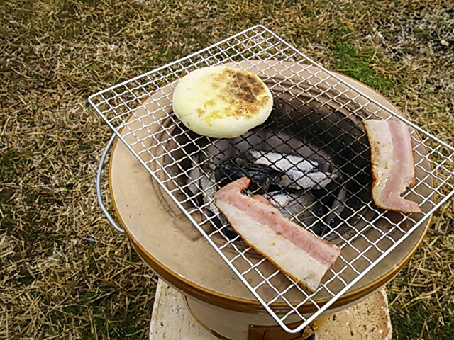 そして昨日の朝焚き火用に買ってきたベーコンをじゅうぅぅ~っとじっくり炭火焼き。 マフィンもこんがり焼いて、マフィンにマヨネーズを塗って、ベーコンを乗せて食べた。 この、美味しさといったら!!!!