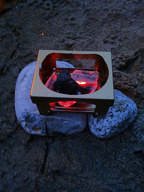最初のうたから入れておいた炭も 十分 火がついたようなので、、、、これまたおニューの 焚き火台ちびっこ君に、炭をうつし、
