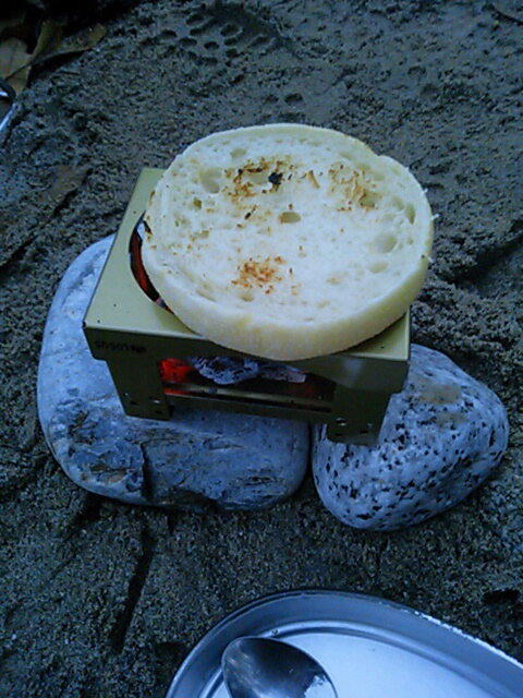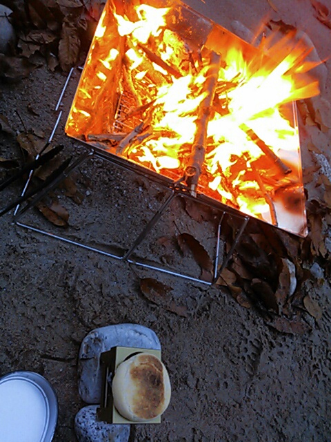次回は面倒でも温めたほうがいいかな。。 もう一枚 マフィンをこんがりっと焼いて、ぷぁりっっとほおばった。 おいしいな~! このLOGOSのちびっこ君はうんと小さく折り畳めるもので、携帯にばっちり。 こうして炭でちょっと焼くという使い方 いいぞ。 小さな網があるともっといいかな。