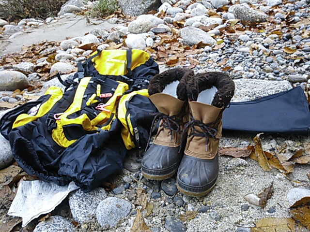 70Lのリュックと ソレルのブーツ。 一番右が焚き火台入れ。