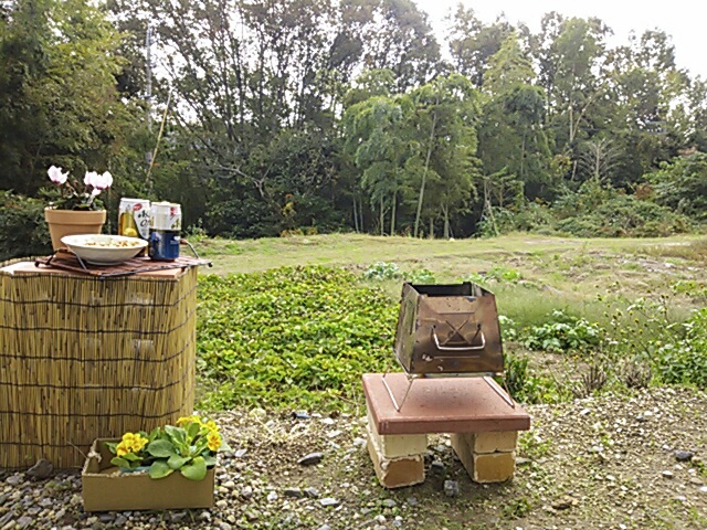 帰ってきて荷物を片づけて、さっそく焚き火台置き場の製作にとりかかる。。。。 すぐ出来た!