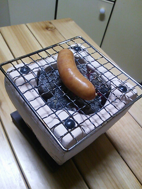 でももったいないので、前から持っている極少卓上七厘に炭をつめこみつめこみ、、、ウインナーをのせてみた。。。 じゅうぅぅぅ~、、、、、、と じわじわ焼けて