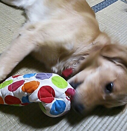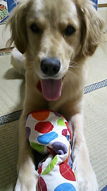 ↑ 奥にプヒプヒボールを入れた鍋つかみ。 取り出そうと振り回したり、口を突っ込んでみたり、大暴れしていた。 生地がかなり頑丈でよかったが、結局 また噛みちぎられてしまった。。。 ほんとになんでも破壊する。。 でももう一つ かなり値段はしたけど、すごい頑丈極まりない引っ張りっこグッズをショップで発見。 こちらのほうはまだ大丈夫! やはり高いものは違う。 かわいいぬいぐるみとか、買ってあげたいなと思うけど、どうせ一時間ともたないだろうからね~。