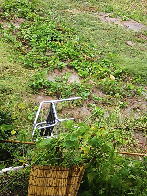 立派過ぎたゴーヤ棚は倒れて見るも無残に。 そしてイスが前の畑にふっ飛んでいる~! ぎょえ~っ!!! びっくり。 程よい重さのあるイスだから大丈夫だろうと思っていたのだけど。。。