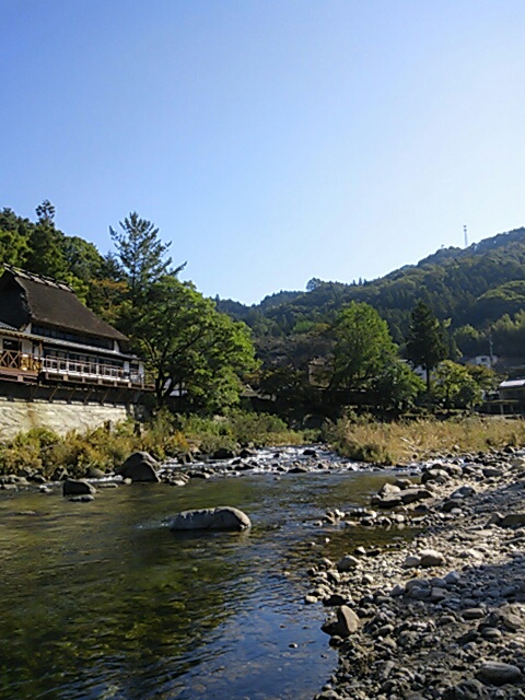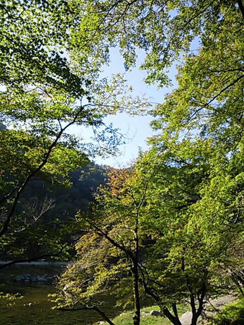 コンビニで ちょっとしたおやつを自分用に買い、いつもの 足助街道をゆくと、、、 足助の かなり 手前で渋滞。。。。うっひゃ~(- -;;; まだ紅葉はもう少し先なのに。。。。 バイクだったら へこたれてる渋滞だよ。 香嵐渓に8時頃 着いたのかな。。。。 リュックに、あれこれ、サッと取り出せるいつものお散歩バッグもかけて、いざ 出発。 うちのまわりも 静かだけど、やっぱり足助は 全然 違うね!!!!