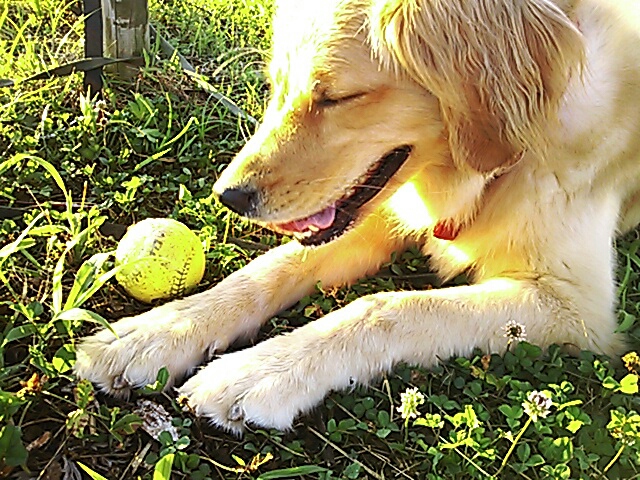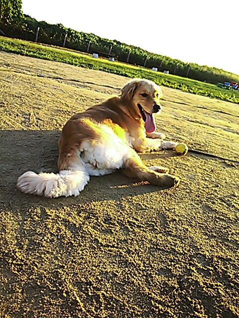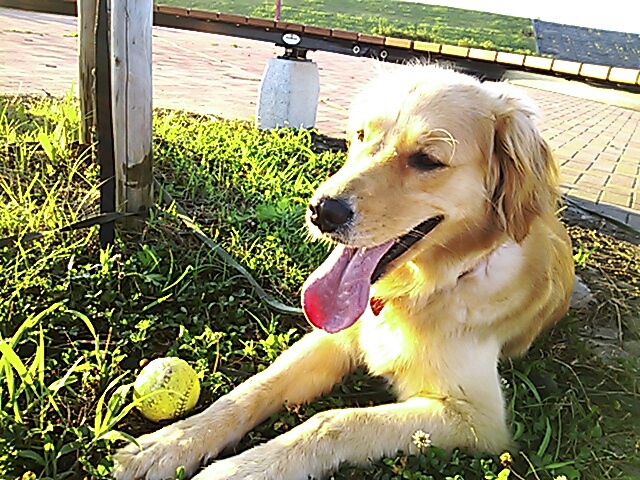 でも広場では、ボールを追いかけて大喜びで走りまわっていた。 9メートルのロングリードをしている。 やっぱりたまにはこういうところで思いっきり走らせてあげたほうがいいね。 途中から、草むらにフセてゼーハーゼーハー。 ベルはよっぽどこうはならなかったなあ~。