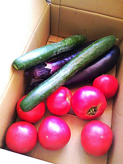 窓を開け放ち、扇風機をかけ換気しながら、そうじ。 となりのおじさんが食べきれないからと、野菜をどっさり下さった。 私も一人では食べきれないけれど、うれしかった。