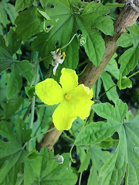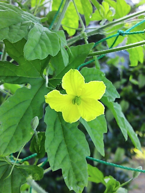 ゴーヤには雄と雌の花があり、雄花はおしべが黄色、雌花は黄緑色なんだそうな!! 知ってた? よく観察してみると、ほんとに色が違~う! 面白いものだー。 で、こうして別々なので、虫とかが受粉してくれないと実にならない?とかなんとか。