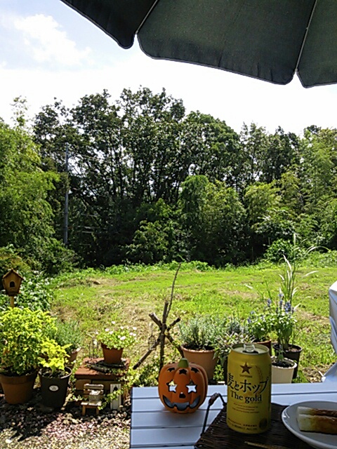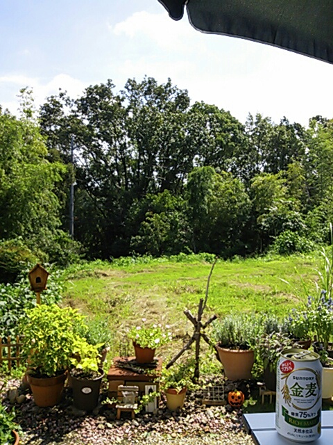外はすごく暑かったけど、日陰で風が吹いてれば まあまあ心地よく、晴れた空を眺め ツクツクボウシの鳴き声を聞きながら 外でビ-ルを飲んだ。 発泡酒だけど。 人で、混雑したお店とは違い、ここは他に誰もいない自分だけの場所。。。。 ほんとにほうっとする。