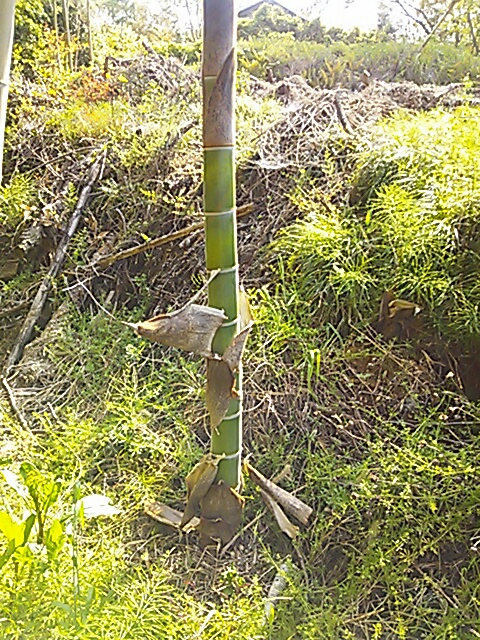 さて。 うちの畑の向こうの竹林。 タケノコがにょきにょき生えてきて、びっくりしたものだが、日々、すくすくと成長し、今では見上げるほどになり、みずみずしい青竹が、、、。 タケノコって、こんなふうに 竹 になっていくのだなあと、窓から眺めることのできる贅沢さ(^^) ほんとに幸せな日々。 おじいさんからタケノコも頂いたし。