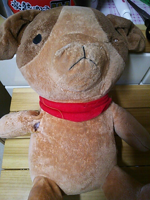 さて、ヌイグルミの通称 ワンちゃんだが、予想を上回ってまだ健在だ。 3日ともたず、かめにボロボロにされるだろうと予想していたが、そろそろ3週間くらいになるのではなかろうか。 はじめの頃は、毎日チクチクともげた鼻だの なくなった目だの ちぎれかけた腕などを 夜鍋をして縫っていたが、最近は穴があくこともめっきりなくなった。